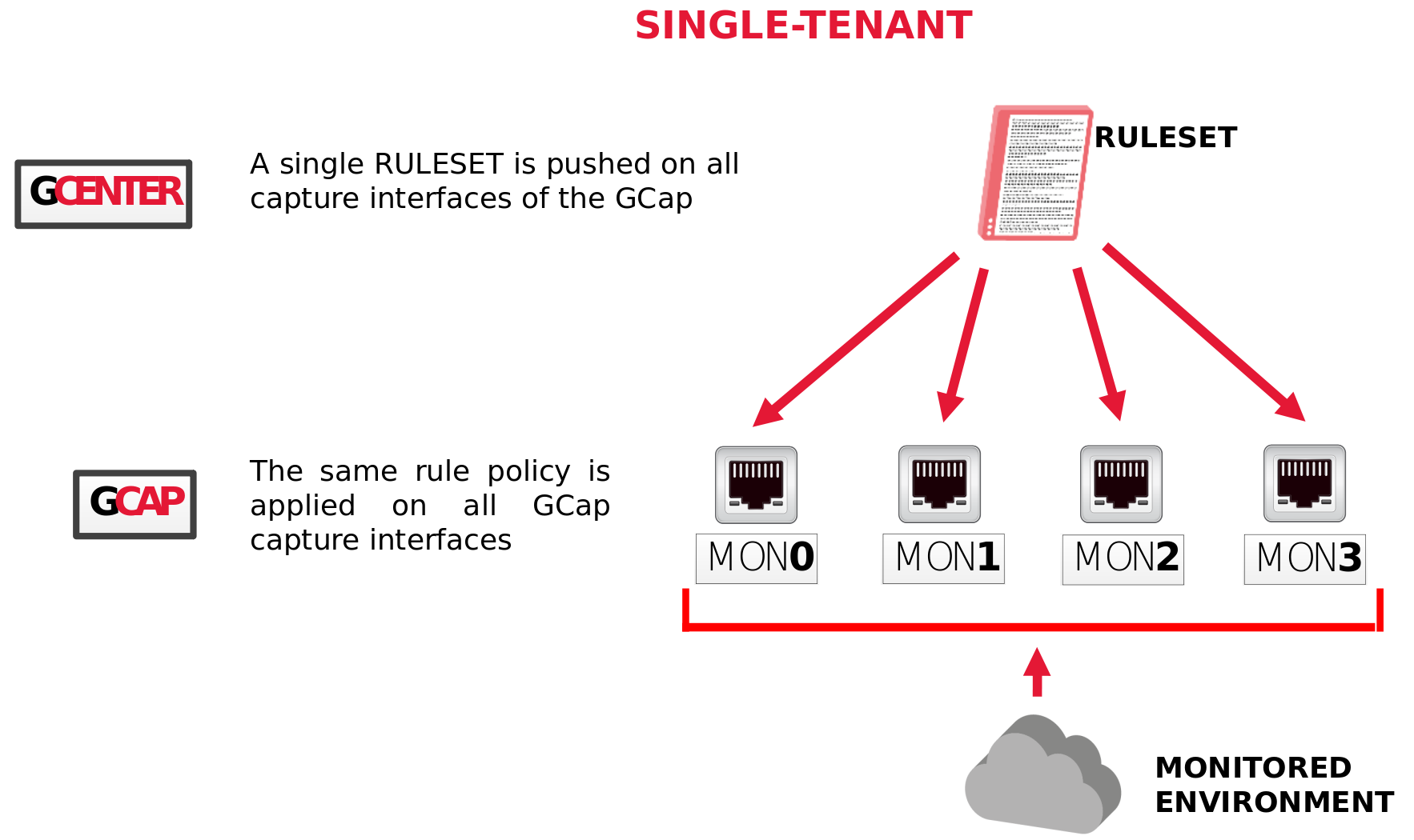 The GCap detection engine applies this ruleset to all capture interfaces: this is the single-tenant configuration.
