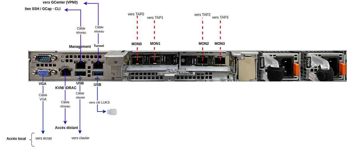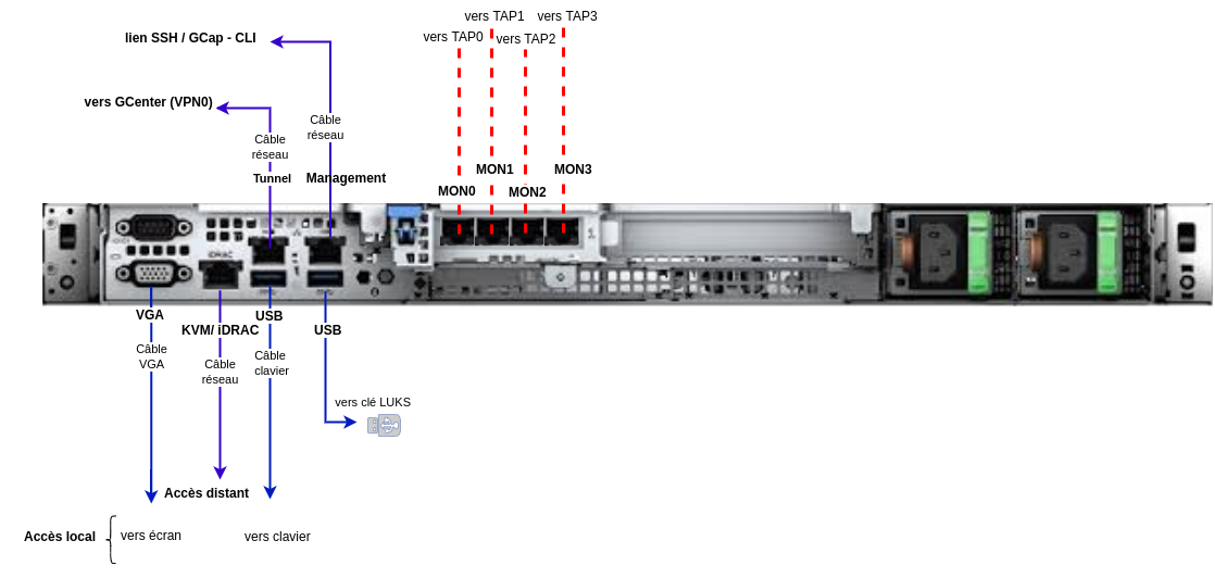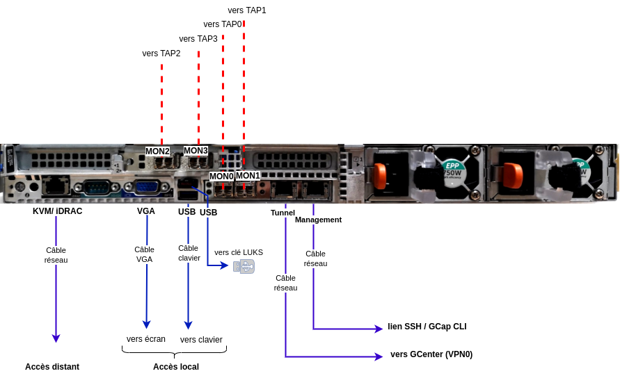 • sur un serveur Dell, ce connecteur est appelé iDRAC et est noté sur le schéma KVM/IDRAC GCap